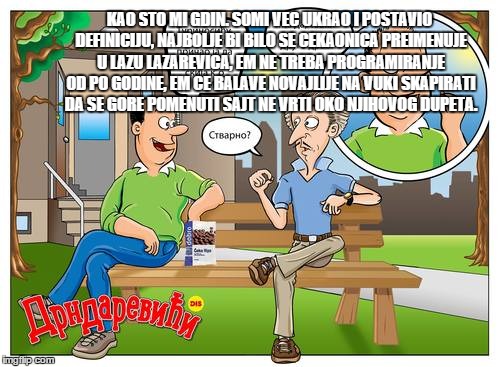 Kao sto mi gdin. Somi vec ukrao i postavio definiciju, najbolje bi bilo se Cekaonica preimenuje u Lazu Lazarevica, em ne treba programiranje od po godine, em ce balave novajlije na Vuki skapirati da se gore pomenuti sajt ne vrti oko njihovog dupeta.ae nek neko ubaci u ovaj oblak kod ovog debeljka sa mog avatara ne kod ovog stvarno? lika nek ostane stvarno?